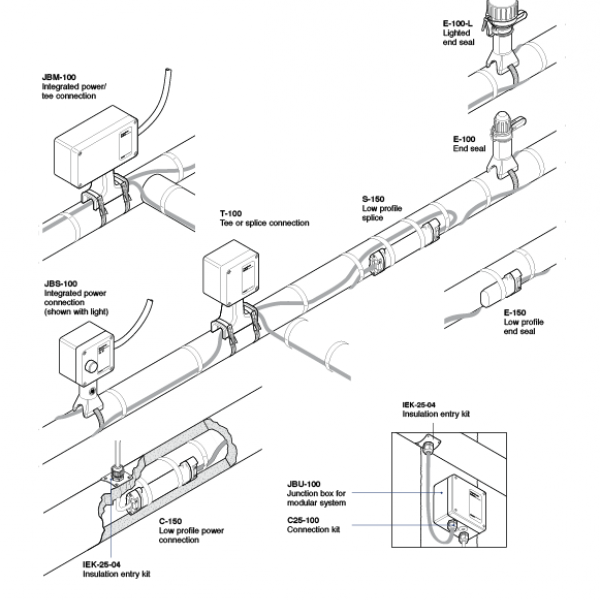 The JBS-100 kit is designed to connect power to one Raychem BTV, QTVR, XTV, KTV or VPL industrial parallel heating cable. It is approved by FM, CSA, and PTB for use in haz ard ous locations. The JBS-100 integrates the functions of both connection kits and insulation en tries. The rugged stand protects the heat ing cable and allows for up to 100 mm (4") of thermal insulation. The core sealing boot does not re quire a heat gun or torch for the in stal la tion (no hot work permit necessary). The non-curing sealant (silicone free) in the boot al lows easy installation and fa cil itates maintenance.